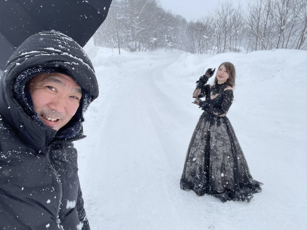 雪景色の中でモデルを撮影しながら、